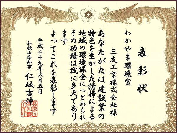 発想と知恵で和歌山を活性化させる意気込みをもって創造しながら地域の皆様とともに環境活動に取り組み、その長年の功績に対し「平成29年第16回わかやま環境賞」を受賞しました。
