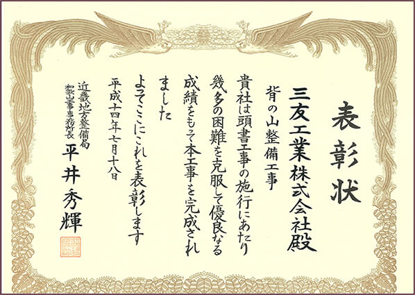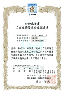 国土交通省近畿地方整備局長より「令和3年度工事成績優秀企業認定書」を頂きました。2016年度より6年連続6度目の認定となりました。今後もより一層工事技術の向上に努めてまいります。