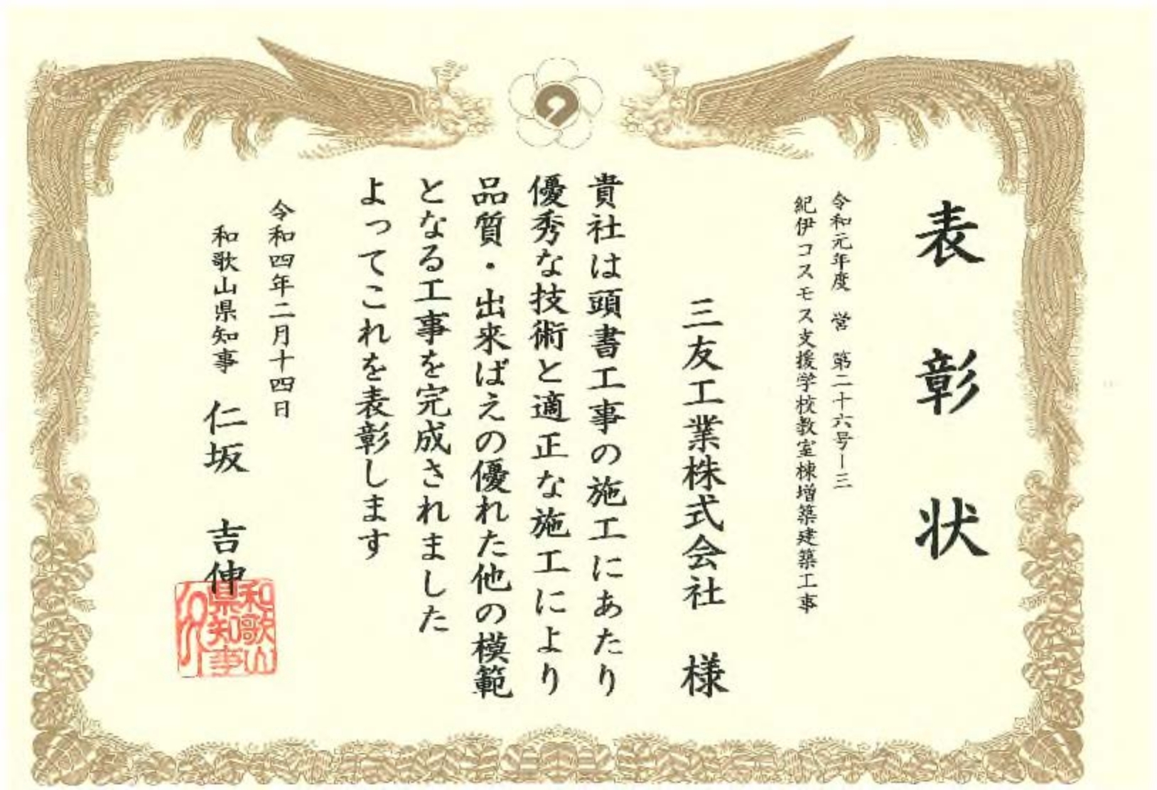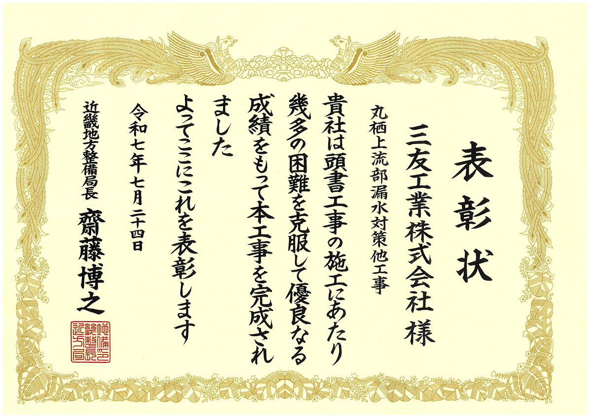 国土交通省近畿地方整備局⻑より「令和5年度工事成績優秀企業認定書」を頂きました。