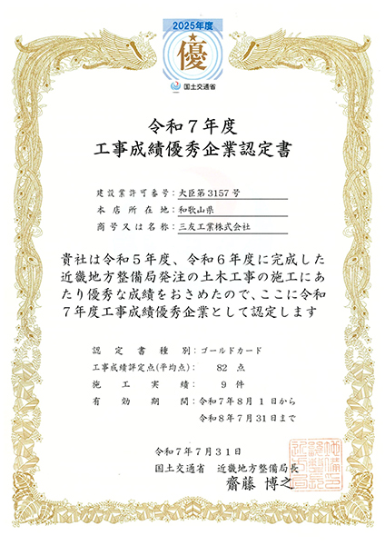 国土交通省近畿地方整備局長より「令和7年度工事成績優秀企業認定書」(ゴールドカード)を頂きました。