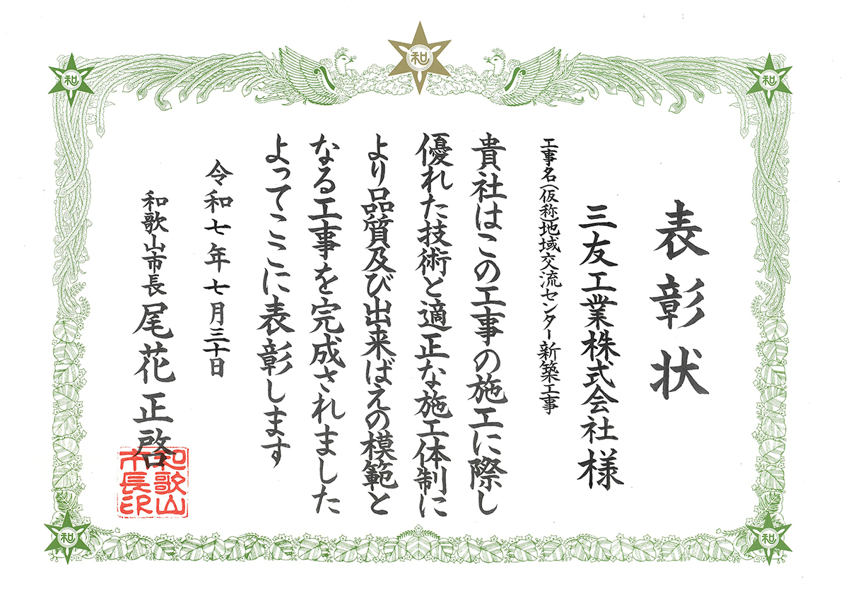 和歌山市より、当社が施工した「(仮称)地域交流センター新築工事」が表彰されました。